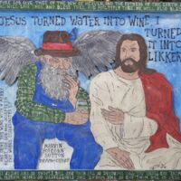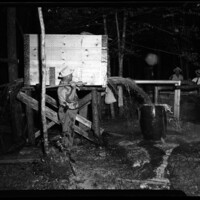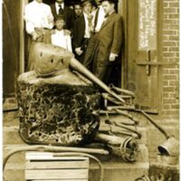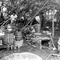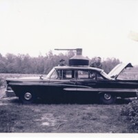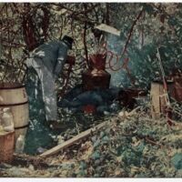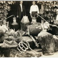Two police officers standing behind a car that is outfitted with a liquor still built into it